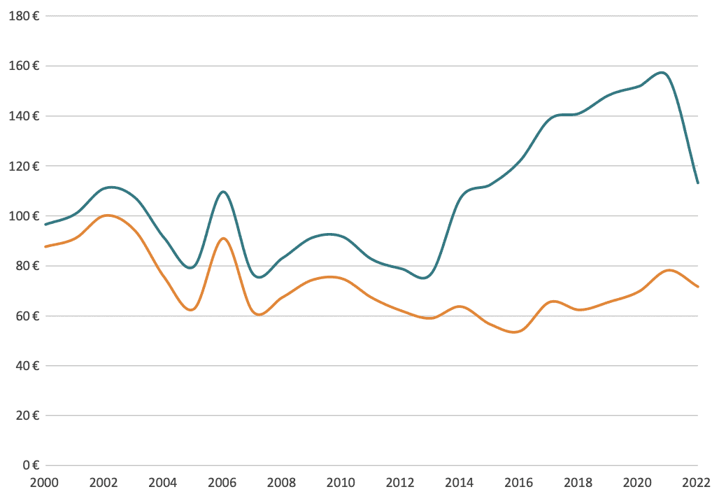 The effects of the Green Deal Industrial Plan of 2023 cannot yet be assessed, as state aid data is only available up to 2022. However, national green subsidies to industry in the EU have been growing steadily long before 2023 and even prior to the introduction of the European Green Deal in 2019. Figure 3 illustrates the evolution of total state aid measures since 2000. The blue line represents all state aid, including subsidies aimed at “Environmental protection, including energy savings” – what could colloquially be termed green subsidies. The orange line, by contrast, excludes them.