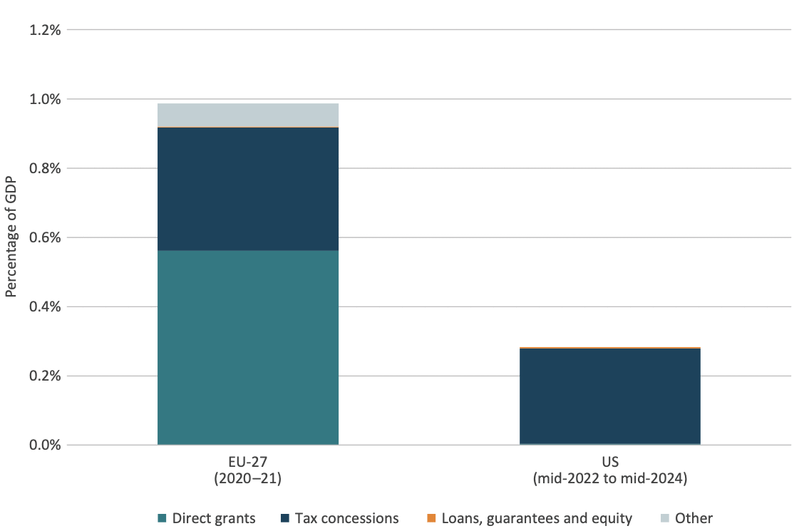 - The US Inflation Reduction Act (IRA) model: the US approach relies primarily on tax credits rather than direct grants. The IRA, introduced in 2022, aims to boost clean energy and industrial innovation by offering broad-based tax incentives to businesses. This method contrasts with the EU’s heavy reliance on direct subsidies, which are often highly selective and risk distorting competition.