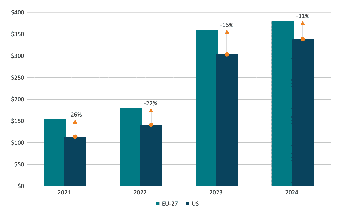 The IRA’s industrial policy model contrasts sharply with the EU’s overarching approach to state aid. However, a more accurate comparison between the US IRA and the EU should focus specifically on European green industrial subsidies rather than encompassing all state aid measures. The most notable policy framework for green initiatives in Europe has been the European Green Deal, unveiled in late 2019. Under this framework, the European Commission has introduced various policy measures, ranging from new regulations to stricter carbon pricing mechanisms. However, in its industrial dimension, the financing of the Green Deal is predominantly undertaken by individual Member States rather than through a common EU funding mechanism.[7] This trend has become even more pronounced since February 2023, when the European Commission, responding to perceived threats to EU competitiveness posed by the IRA, introduced the Green Deal Industrial Plan. This plan aims to streamline the regulatory environment and accelerate state aid funding for clean technology investments in Europe through a temporary, ad hoc framework.[8]