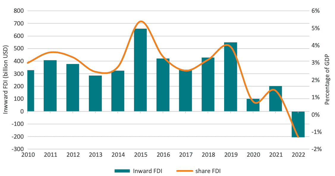 The Irish Central Statistics Office estimates that the stock of FDI in Ireland increased from EUR 141 billion in 2005 to EUR 1,299 billion in 2023,[67] a percentage growth far exceeding its GDP growth during the same period. As a comparison, the stock of FDI in 2005 was equal to 79 per cent of Ireland’s GDP, while in 2023, this proportion had risen to 255 per cent. By contrast, based on Eurostat data, the stock of FDI in the EU in 2023 was EUR 18,098 billion, equivalent to 105 per cent of the EU’s GDP.[68]