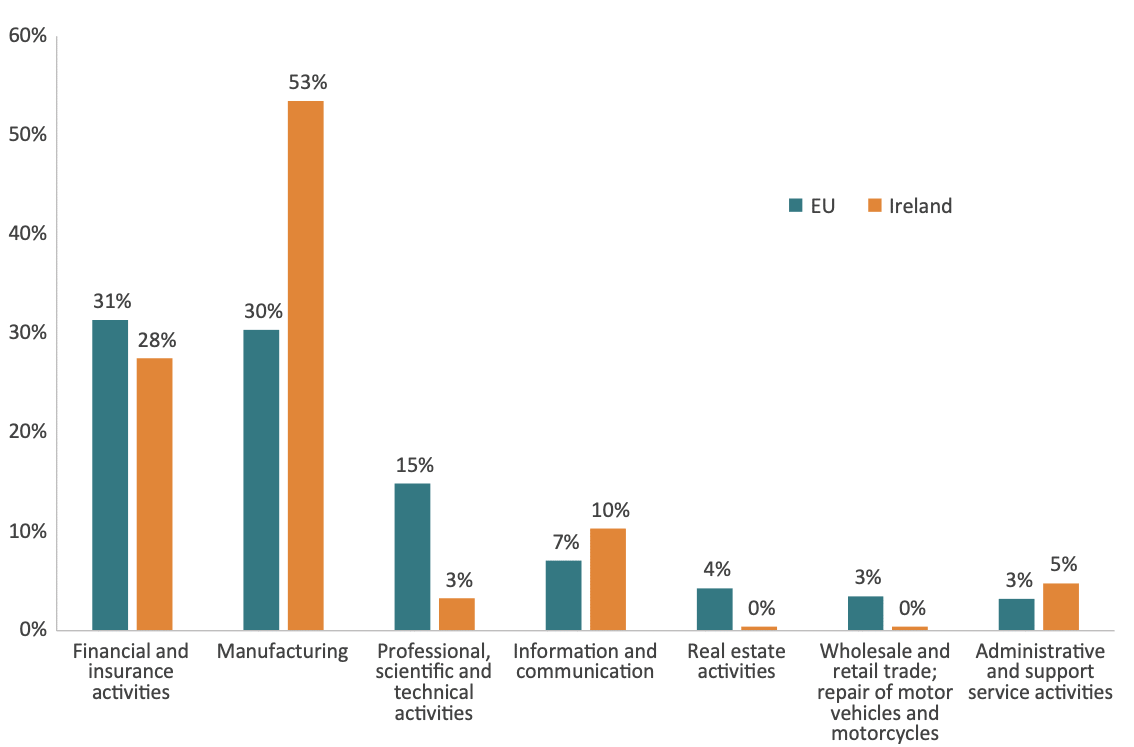 Figure 11 presents the sectoral profile of inward FDI between 2013 and 2022 in Ireland and the EU. The figure shows seven economic sectors, which represent 95 per cent of all inward FDI in the EU and 100 per cent in Ireland. There are some similarities: financial and insurance activities represent a similar share of total FDI; however, there are also differences. Professional, scientific, and technical activities constitute a larger share in the EU than in Ireland, whereas the information and communication sector is more significant for Ireland than for the EU. Notably, the main difference between the EU and Ireland lies in the manufacturing sector.