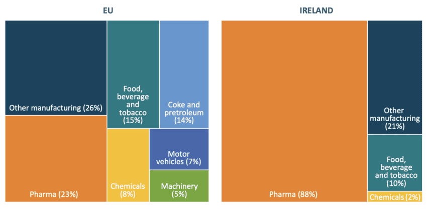 This continuous flow of FDI has contributed to a structural change in the Irish economy, shifting it towards one where manufacturing – specifically pharmaceuticals – and the information and communication sectors have become significantly more prevalent. Between 2011 and 2022, the relative weight of the manufacturing and ICT sector in the Irish business economy went from 52 to 68 per cent while the corresponding figure for the EU remained relatively stagnant, increasingly only slightly from 36 to 37 per cent.[70] This is the core aim of any industrial policy: to shift the structure of production towards one with higher levels of productivity. For Ireland, this transition has been from agriculture to industry, and more recently and in part thanks to FDI, from industry to high-tech industries like pharma and ICT.