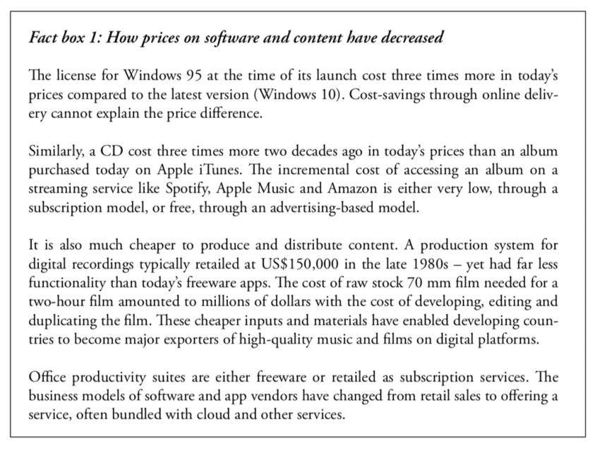 Also, much of the digital content is no longer ‘sold’ but provided as a subscription-based service. However, it is not just the business models that have changed. Global competition and new technologies have brought down the prices of applications and content as well.