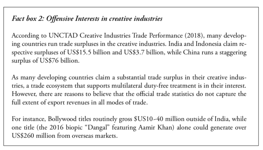 Existing industry data seem to disprove these estimates. For example, cross-border trade in music and film accounts for US$25 billion in UNCTAD (2019) projections, whereas the total global sales of digital content (including domestic and cross-border sales) amount to just US$6 billion. Since the majority of online transactions are domestic rather than cross-border sales, UNCTAD (2019) may exaggerate the trade volumes by 10 to 20 times.