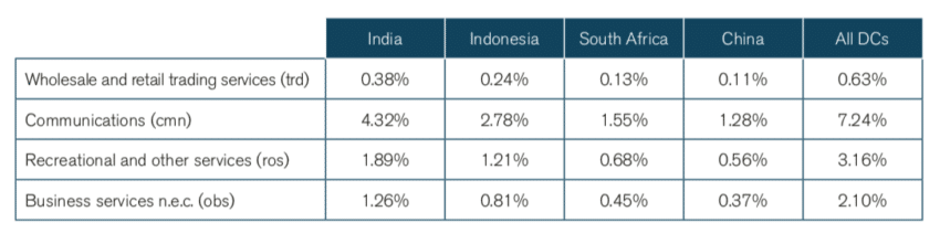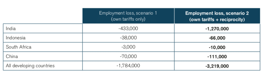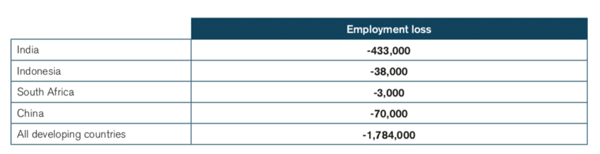 When GDP declines, unemployment rises. In the scenario we have modelled, the imposition of duties would result in a loss of 1.8 million jobs in developing countries. The job losses would be significant due to the large populations being impacted and the importance of the services sector in some of the countries of our study, particularly in the case of India (Figure 3).