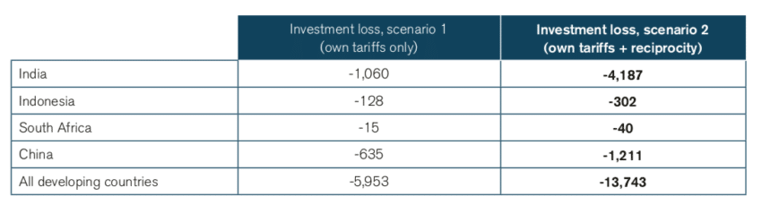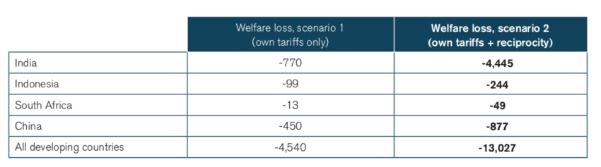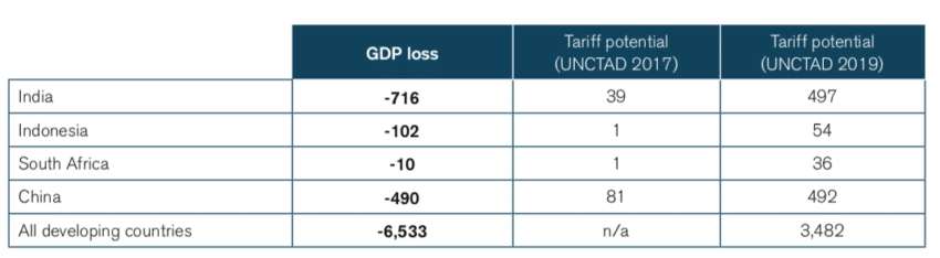 The GDP losses for India would amount to US$1.9 billion – for the sake of collecting a meagre tariff revenue of US$31 million. The loss in GDP would be 49 times larger than the tariff revenues for India, over 160 times larger for Indonesia, over 25 times larger for South Africa and 7 times larger for China. Every country demonstrates strongly negative results that exceed the tariffs revenue by far, which further proves the inefficiency of the ‘ET tariff’ and the poor trade-off between the fiscal revenues for the government and the costs for the general economy.