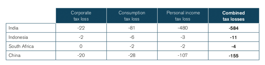 - The combined domestic tax losses under Scenario 2 are much larger than the potential tariff revenues identified in UNCTAD 2017: 51 times larger than the tariffs for India, 23 times larger for Indonesia, 12 times larger for South Africa, and three times larger for China.