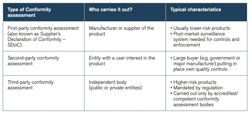 The difficulties faced by EU exporters abroad are related to the different conformity assessment procedures applicable to products, across different jurisdictions. According to the International Standards Organisation (ISO), conformity assessment is described as “different techniques that ensure a product, process, service, management system, person or organisation fulfils specified requirements”.[1] Table 1 summarises the main types of conformity assessment procedures and their key characteristics.
