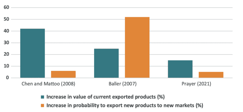 The existing economic literature confirms the existence of all these economic benefits and offers robust estimates of the order of magnitude for trade gains stemming from MRAs (Figure 1). Several empirical econometric estimates indicate that existence of an MRA makes a positive difference both on the value of exports (15-40% increase) and on the probability of firms to export (new) products to (new) markets (up to 50% increase in the probability to export).