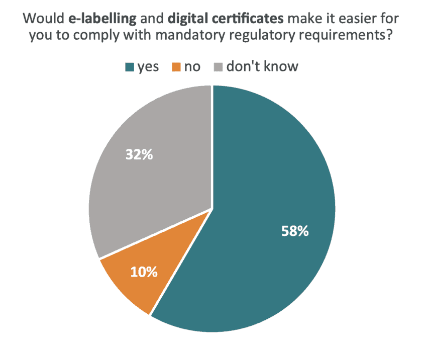 The 2022 survey also contained questions about the importance of digitalisation efforts in the area of certification and conformity assessment. The majority of survey participants (58%) consider e-labelling and digital certificates as having a positive contribution in facilitating compliance with mandatory requirements (Figure 4).