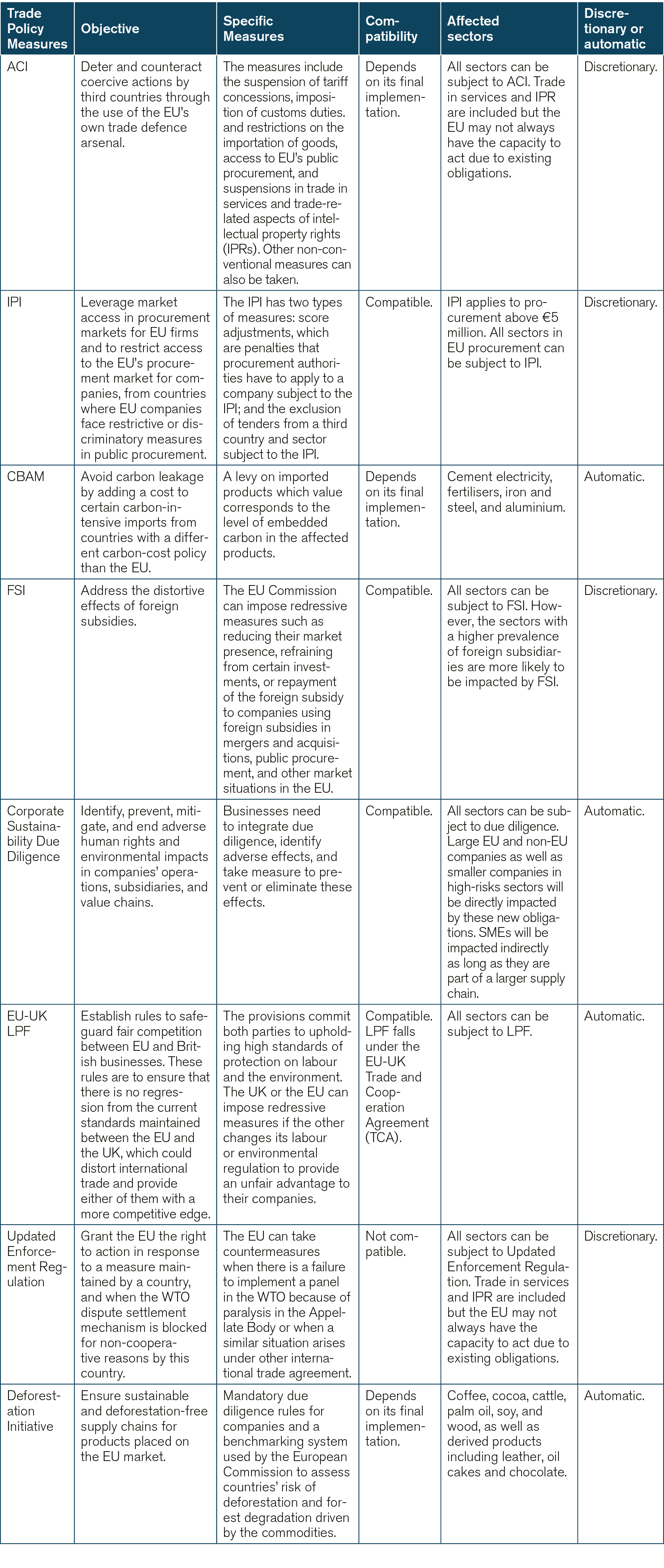 This study undertakes a comprehensive review of proposed and adopted defensive trade policy instruments in the EU, with the purpose of better understanding their design, functioning, and implications. The study covers eight policy instruments at different stages of development. These are: Anti-Coercion Instrument (ACI), International Procurement Instrument (IPI), Carbon Border Adjustment Mechanism (CBAM), Foreign Subsidy Instrument (FSI), Corporate Sustainability Due Diligence (DD), Level Playing Field Provisions in the EU-UK Trade and Cooperation Agreement (LPF), Enforcement Regulation (ER), and the Deforestation Initiative (DI).