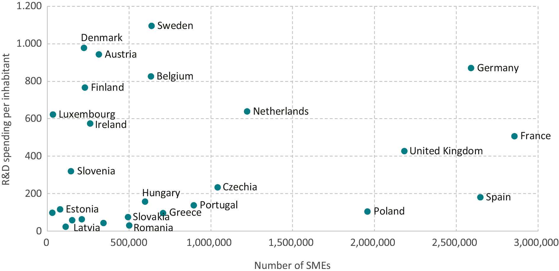 Figure 1: Domestic R&D spending per capita vs. total number of SMEs in 2021, by country