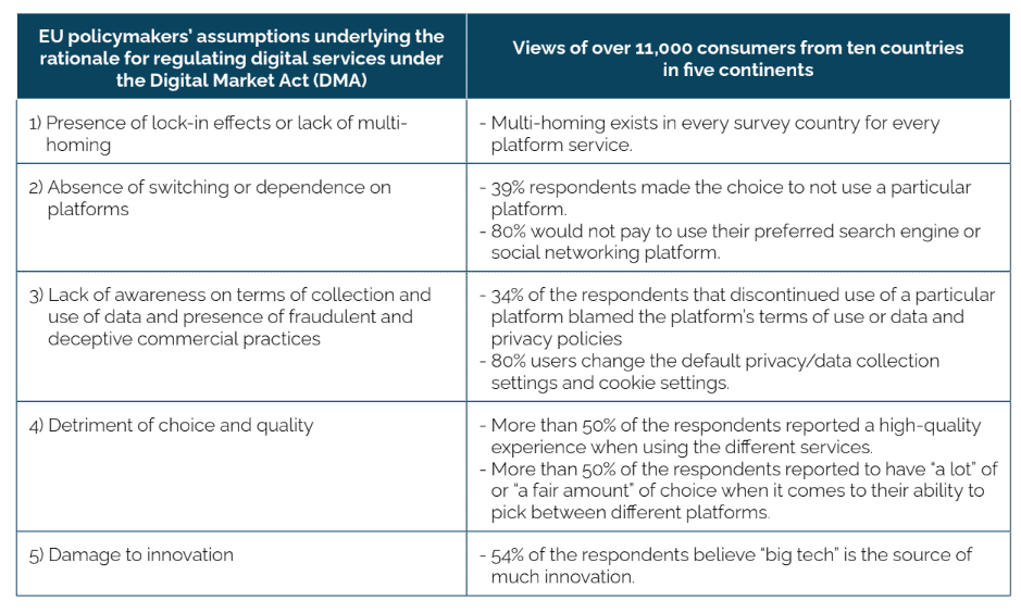 As concerns consumer harm, data reveals that regulators’ assumptions about market dominance and abuse by large digital companies do not align with consumers’ actual experiences. Indeed, market concentration in digital services markets in the EU is not as harmful as policymakers claim when justifying behavioural regulation. The DMA, for example, lists several features that characterise a gatekeeper company and a certain service to rationalise the need for the prescriptive and proscriptive regulation. However, these features are not empirically proven and are instead based on general assumptions regarding the presence of these features in digital markets. A recent study, which is based on large-scale empirical survey data of over 11,000 consumers from ten countries in five continents, challenges many of the reasonings inciting the need for EU regulation of large technology platforms (see Table 1).[9] Of course, there may be individual cases of abuse of power in narrow markets, e.g., self-preferencing (which can also be beneficial for consumers[10]). However, it is highly questionable whether the few known alleged cases of market abuse justify excessive interventions in platform business models and digital solutions that undeniably bring so many benefits to businesses and consumers.