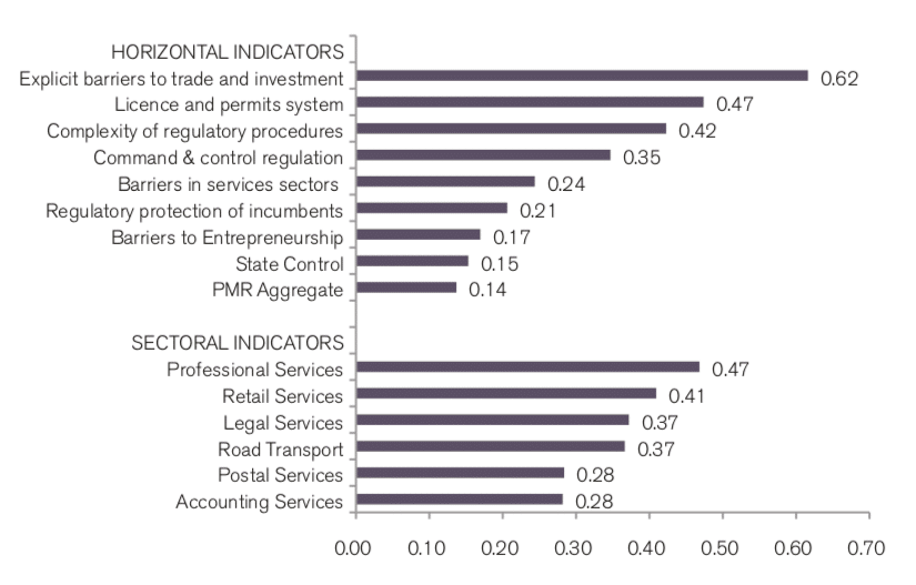 Source: OECD. Indicators of Product Market Regulation, 2013 (most up-to-date indicators). Own calculations. Numbers represent calculated variation coefficients based on national regulatory restrictiveness indices in 2013. The measure reflects the dispersion in national regulations for different regulatory areas. Countries in sample include Sweden, Finland, Belgium, Netherlands, United Kingdom, Germany, Italy, Austria, France, and Spain.