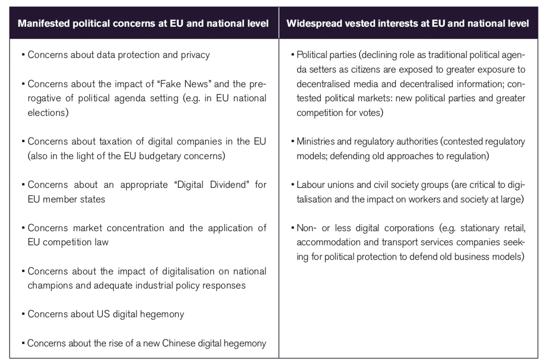 Rent-seeking activities have for a long time preserved anti-competitive market structures and patterns in profits and earnings (see, e.g., OECD 2018). Generally, rent-seeking occurs when individuals, businesses, or governmental institutions attempt to use government laws and regulations to defend or increase personal incomes, profits or political privileges. Rent-seeking is most common when companies and/or public institutions aim to defend existing businesses or regulatory models and have sufficient economic or political influence to do so (see Table 2). A company may, for example, seek laws for import protection from the government. Regulatory agencies may seek to maintain regulatory powers even though economic developments, social trends or new technologies rendered them obsolete. And political institutions may seek rents by seizing control of certain business operations of private-sector companies (and other features of state capitalism). In addition to these phenomena, political hostilities against online platforms in the EU are also shaped by traditional political parties, which, as a consequence of social online media (e.g. Google, Facebook, Twitter etc.), decentralised information and new political narratives, are exposed to greater levels of competition in political agenda setting and new political groups respectively.