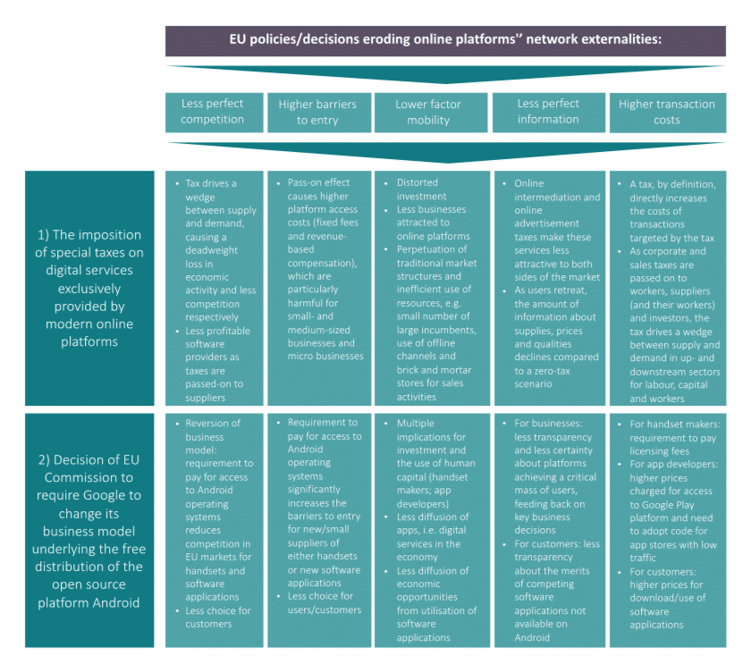 The number of users of modern online platforms in the EU testifies to their contribution to the diffusion of digital services and economic opportunities enabled by digital technologies. This is true for online sellers of physical goods and non-digital services, content providers and app developers. A special tax on certain digital services would effectively erode Europeans’ benefits from the use of online platforms. Similarly, the European Commission’s demand on Google to exclude some of its services from an online platform that is offered for free to many hardware device manufacturers, hits all those who already have invested in Android-based software and hardware technologies and benefits those that run on other platforms not affected by the EU’s verdict. Figure 2 provides a more detailed overview of how these policies impact on platforms network externalities. Generally, such policies render marketplace competition more imperfect, increase the barriers to entry for platform users, slow down or even reverse the use of factors of production, hamper the diffusion of information, and increase the costs of commercial and social interactions. In addition, such policies send strong warning signals to those considering setting up shop in the EU as investors, start-ups or innovators.