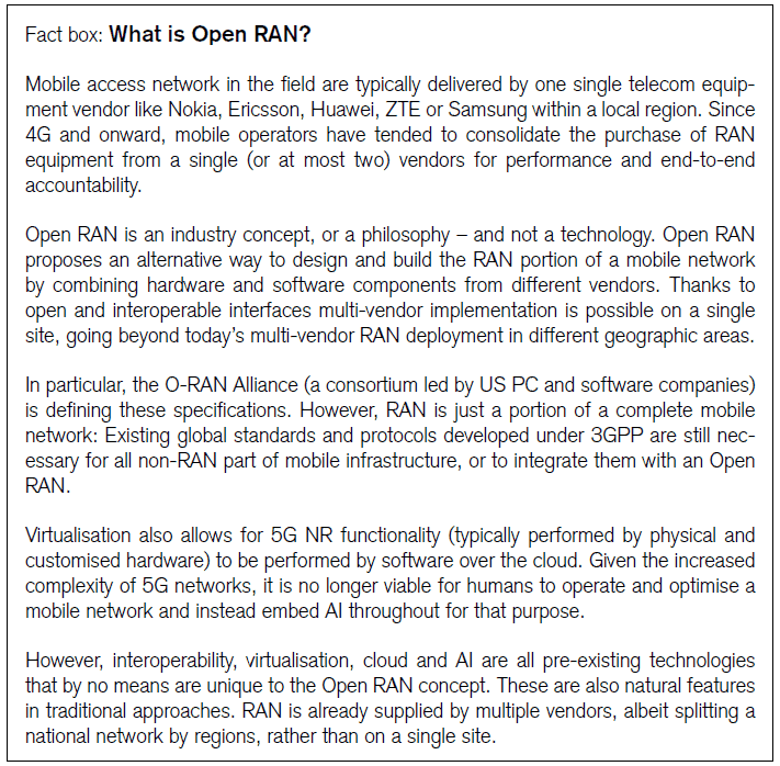It is within this context which Open RAN technology has emerged in the debate: Open RAN is not a new technology in itself but a concept that leverages on recent developments that allow for disaggregation of hardware and software components into smaller parts, and virtualisation and AI that allows RAN functions to be performed in the cloud. Advocates of Open RAN promise lower costs and new suppliers coming into the unattractive RAN market, which has been plagued by massive R&D costs and low profit margins.