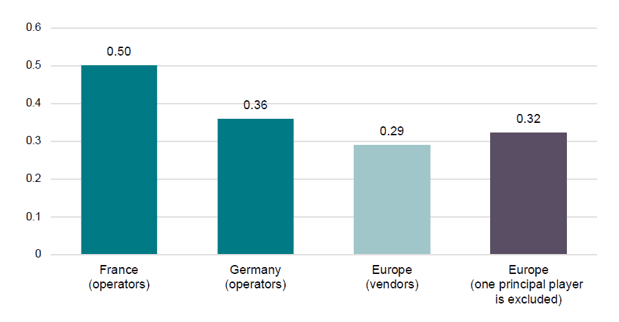 Also, market concentration is distinctively higher for operators compared to equipment manufacturers in Europe than elsewhere. In France, for example, the market concentration on the operator market is equivalent to the level of a duopoly, nearly twice the levels of the vendor market. In the US and China, the buyers and sellers are on an equal footing as one large vendor – Huawei and Ericsson respectively – holds nearly half the market.[2]