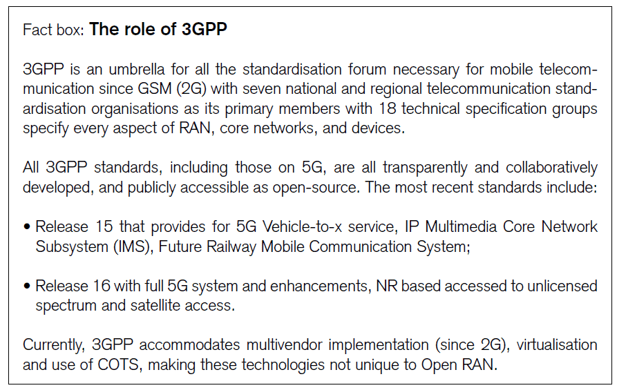 - Some industry voices suggest that a certain Open RAN specification could replace existing global specifications under 3GPP. However, as today’s market condition is not caused by the 3GPP standardisation, a solution is not to be found through developing alternative technical specifications. 3GPP is also more comprehensive than RAN.