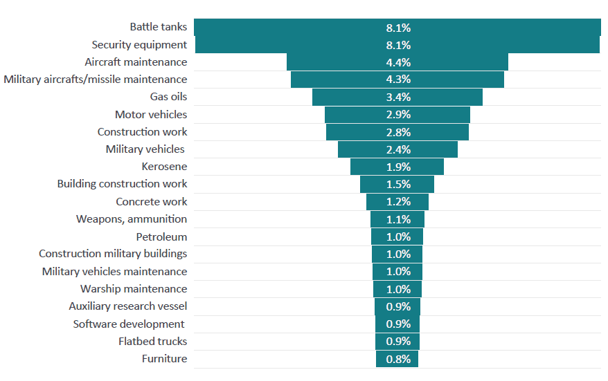 [7] Figure 2 lists 20 products by Common Procurement Vocabulary (CPV). CPV is a standardised classification system for goods, services, and works in European public procurement used to publish tenders on TED. The list of products and codes is the following: Battle tanks (35411000); Security equipment (35000000); Aircraft maintenance (50211210); Military aircrafts/missile maintenance (50650000); Gas oils (9134000); Motor vehicles (34100000); Construction work (45000000); Military vehicles (35400000); Kerosene (9131100); Building construction work (45210000); Concrete work (45262300); Weapons, ammunition (35300000); Petroleum (9130000); Construction military buildings (45216200); Military vehicles maintenance (50630000); Warship maintenance (50640000); Auxiliary research vessel (35513200); Software development (72000000); Flatbed trucks (34134100) and Furniture (39000000).