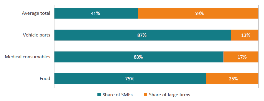 The TED database also provides valuable information about the size of bidding firms. On average, 41 percent of bids came from SMEs and 59 percent from large firms. However, averages mask wide disparities. In nearly half of all TED defence tenders in 2023, no SMEs submitted bids. These results point to stark differences in SME participation across product categories. Figure 5 shows that in some categories, such as vehicle parts, medical consumables and food, SMEs were the dominant bidders.