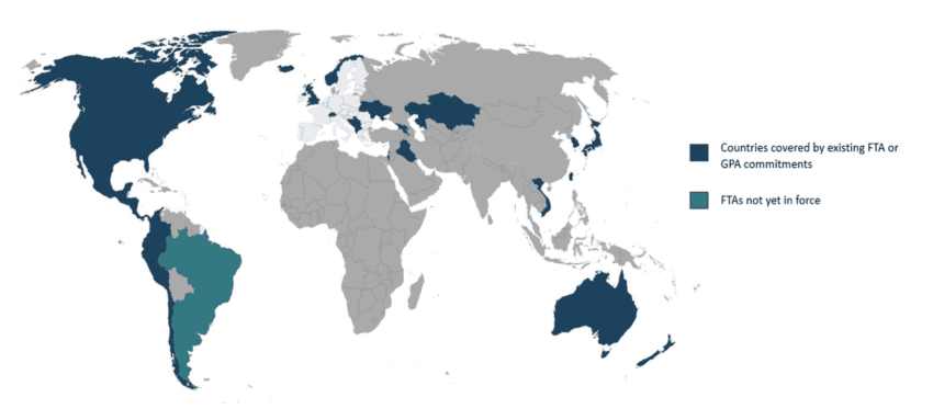 Figure 1: Countries with binding reciprocal procurement provisions in trade agreements vis-à-vis the EU