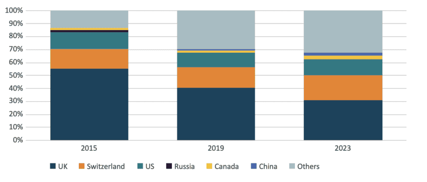 This raises an interesting empirical question: is there too much or too little participation by foreign bidders in EU public procurement procedures? To answer this question, the EU Tenders Electronic Daily (TED) database could be used. Looking at the period between 2011 and 2023 (the data for 2024 is incomplete), the TED data indicates that participation by foreign firms in EU procurement is diverse, yet also fairly concentrated. Even though the share of contracts awarded via Mode 1 to firms located outside the EU remained at a fairly low level, it has tripled over that period, with bidders from over 100 non-EU countries winning at least one public procurement contract from EU contracting authorities. At the same time, firms located in the UK, Switzerland, and the US won over 80 percent of all contracts awarded to foreign firms located outside Europe in 2015. Although this geographical concentration declined over time, the UK-Swiss-US trio still accounted for over 60 percent of contracts awarded to foreign firms in 2023 (Figure 2).