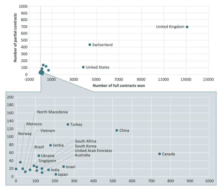A second empirical question is whether foreign bidders are successful in the EU procurement market when contracts are split into lots or when they are part of international consortia. The TED data indicates that foreign firms won both full and partial contracts. Figure 3 illustrates the differences between various foreign bidders in terms of two metrics: (i) the number of full contracts won on the x-axis; and (ii) the number of partial contracts won by foreign bidders (either when contracts are split into lots or won via consortia) on the y-axis. As seen before, the UK, Switzerland, and the US remain the dominant players among foreign bidders in terms of the number of contracts won either fully or partially. A second tier of successful foreign bidders also comes from countries that are relatively close to the EU or countries that benefit from preferential market access to the EU via various trade agreements, such as Canada, Turkey, Israel, Japan, and Serbia. China is the only country that appears in the top five countries participating in the EU public procurement without having the proximity advantage or a secure preferential market access via trade agreements (FTAs or the WTO GPA).