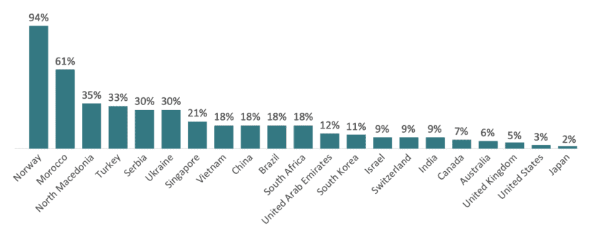 While the share of partial contracts in the total number of contracts won by foreign bidders over the 2011-2024 period remained on average at around 7 percent, for a number of countries, the recipe for success in the EU procurement market was precisely the participation in contracts split into lots or as part of an international consortium (Figure 4). For instance, Norwegian bidders seem to have almost exclusively won contracts that were split into lots and via consortia. Moroccan bidders are also particularly successful at winning partial contracts: over 60 percent of all contracts won by Moroccan bidders were partial contracts. Contracts divided into lots were also important for bidders from Turkey, Serbia, Ukraine, Singapore, Vietnam, China, Brazil, and South Africa. US and Japanese firms were the least interested or successful in participating in contracts divided into lots.