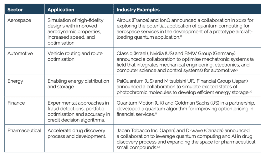 Interdependency also generates positive spillover effects across various fields (e.g., quantum computing, communication, and sensing) and sectors such as aerospace, automotive, energy, finance, and pharmaceuticals. For example, the partnership between D-Wave, a Canadian quantum technology developer, and Volkswagen (VW), a German car manufacturer, resulted not only in the commercialisation of traffic management software but also in the development of quantum-based solutions for optimising car production logistics.[2]
