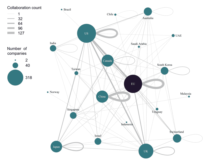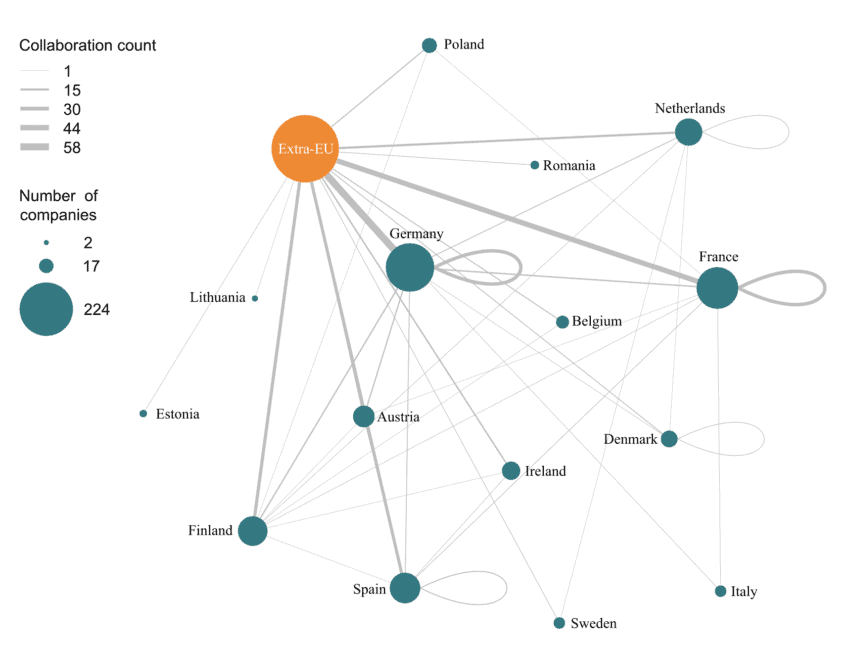 The dataset of collaborations and the methodology used to analyse them present three main limitations. Firstly, as the aim is to examine collaborations within the private sector, partnerships between academic or public research institutions and companies are excluded. Such collaborations are significant drivers of knowledge transfer between countries. However, the dataset does include private companies that are spin-offs of universities and public research centres. Secondly, collaborations will continue to evolve, and there is no reason to assume that past patterns will persist in the future. Therefore, the analysis should be viewed as a snapshot at a specific point in time of an ongoing process. Thirdly, the network analysis[1] used to map the collaborations provides information on the number of collaborations but does not account for their depth. In other words, two collaborations with different levels of investment are given equal weight, whereas in reality, projects with larger funding are likely to be more significant.