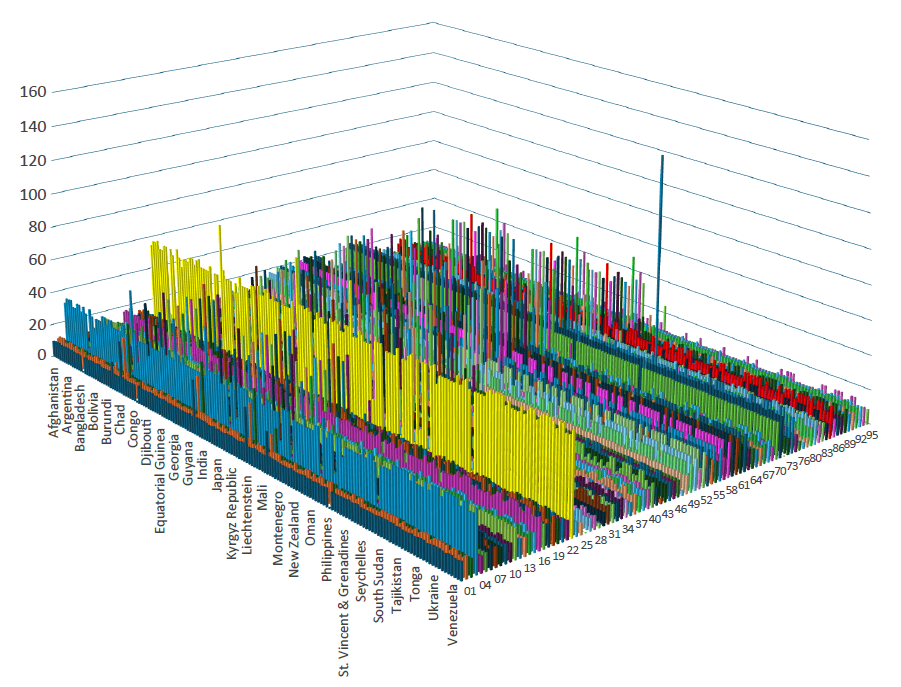 One way to simplify the more than 3 million data points in the US tariff landscape is to zoom out from the 10-digit product categories to the broader 2-digit level. This is essentially like enlarging the pixels in a picture. In doing so, we simplify the tariff landscape, reducing it to fewer than 20,000 data points.