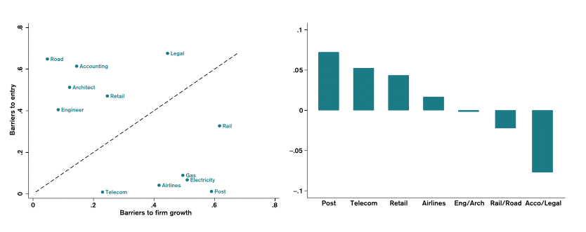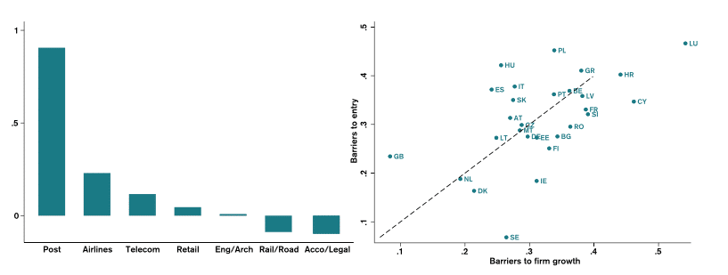 These categories of services regulation have a knock-on effect on productivity in the EU. Detailed studies such as Arnold et al. (2011) and Van der Marel et al. (2016) have shown how they depress productivity in EU countries.[2] This can also be seen in the right-hand panel of Figure 1 in which the average productivity of each sector is shown in order of importance. It shows that postal, telecoms, retail and airline services all have positive growth effects. These are exactly the sectors which already have experienced lower entry barriers for firms. However, their growth is still below their potential and their productivity levels are still modest. Reducing these sectors’ post-entry barriers of firm growth and expansion will therefore increase the potential to create further productivity growth.[3]