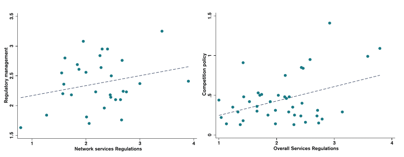 Yet, there is generally a systematic relationship between regulatory policies and regulatory governance as shown in the left-hand panel of Figure 3. The vertical axis shows the score of regulatory management from 0 (the most effective governance structure) to 6 (the least effective governance structure) in services.[5] The horizonal axis illustrates the level or regulatory restrictions in services. The figure shows indeed that countries with higher regulatory barriers in services are also the ones with least effective governance structures to tackle services reforms.