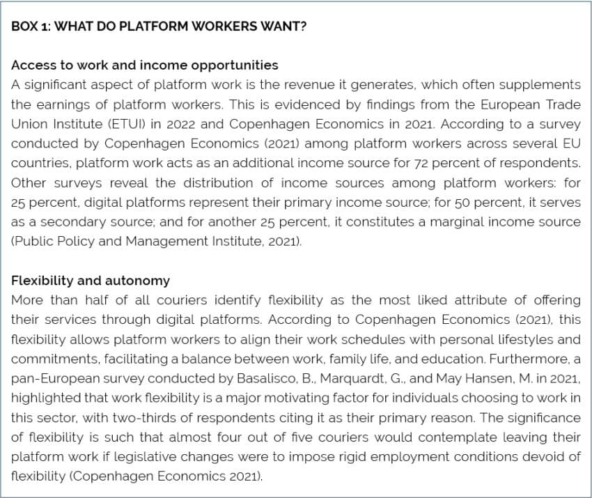This Policy Brief operates under the assumption that a straightforward yet fundamental objective is shared in the regulations of the four countries: the improvement of working conditions for platform workers. In pursuit of this goal, it is crucial that policymakers pay close attention to the voices of platform workers themselves. The needs and preferences of platform workers are clearly reflected in surveys conducted across the EU (see Box 1). The collected evidence indicates that platform workers desire an adequate level of protection while retaining the benefits derived from digital platforms. These benefits include access to work, income opportunities, flexibility and autonomy.