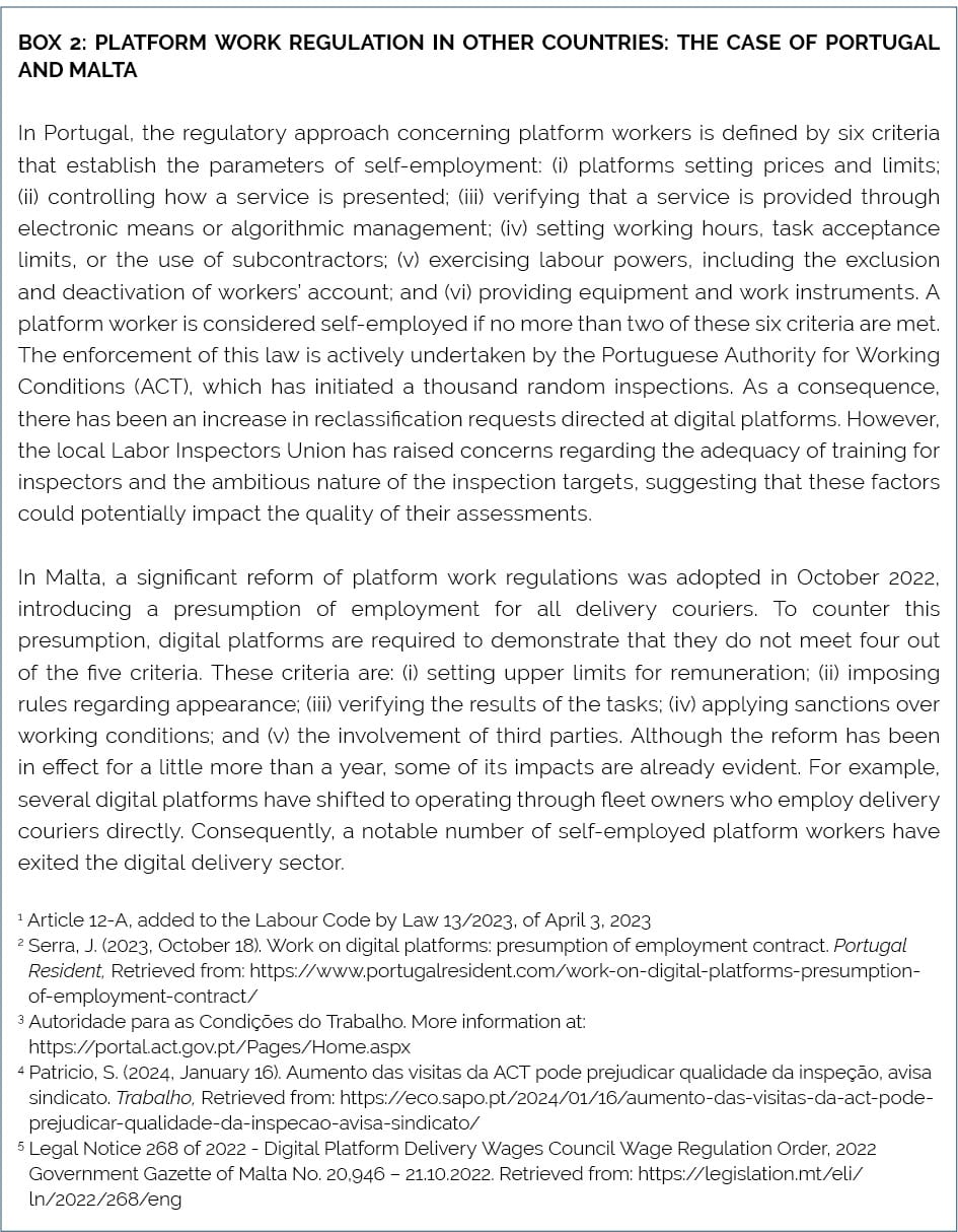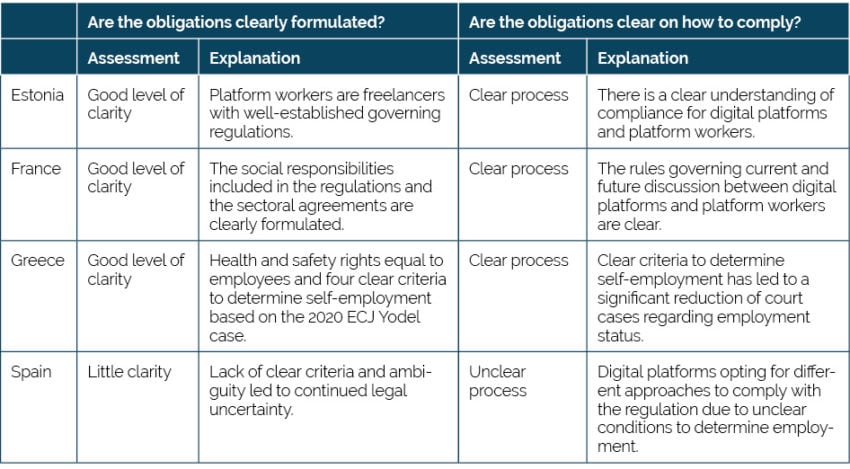 In Estonia, platform workers are treated in the same way as other freelancers, with well-established and straightforward regulations governing self-employment. This clarity in the regulatory framework facilitates compliance. Greece has established clear criteria for determining the presumption of self-employment for platform workers. The clarity of this law in addressing the question of employment status has led to legal certainty and a marked reduction in the number of court cases, which also indicates better compliance with the law. The French government has implemented regulations that provide clear guidelines regarding the social responsibilities of digital platforms and a structured platform for discussions between digital platforms and platform workers. The rules governing these discussions are well-defined and have resulted in tangible outcomes. Conversely, in Spain, the absence of clear criteria to determine employment status and the broad assumption that all platform workers are employees have resulted in ambiguity regarding the responsibilities of digital platforms and platform workers. This lack of clarity is evidenced by the varied approaches digital platforms have taken to comply with Spanish regulations and the ongoing legal uncertainty surrounding the working conditions of digital delivery workers.