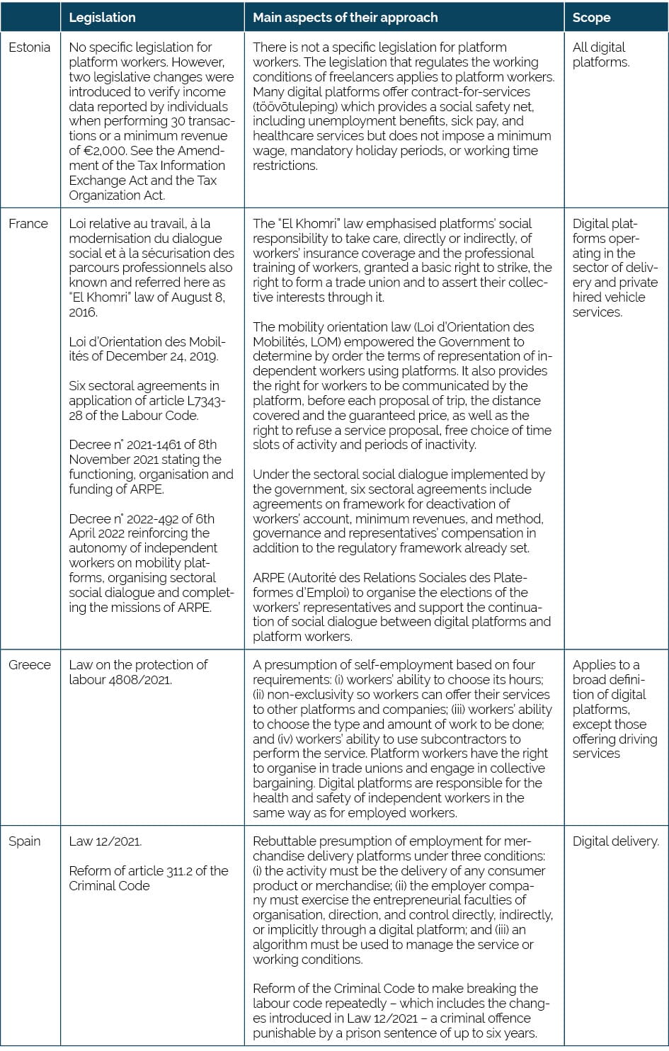 Table 1: Digital platform work regulation in Estonia, France, Greece, and Spain