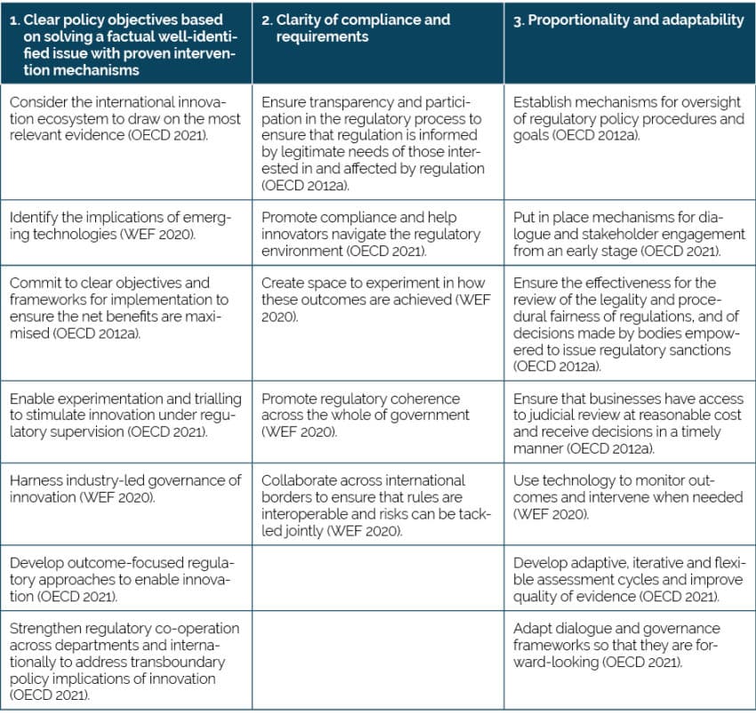 In its work, the OECD emphasises the importance of clear objectives and robust implementation frameworks as crucial to the efficiency of regulations. It also recommends ensuring transparency and participation in the regulatory process, to ensure regulations are informed by the legitimate needs of those affected. Similarly, the WEF stated that adaptability and learning mechanisms are centrally important for regulations to evolve, preventing them from becoming a source of economic harm. Based on this research, Table 2 distils three key principles of good regulatory design.