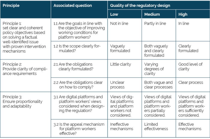 Principle 1 evaluates whether the objectives stated in the regulations are in line with the overarching aim of enhancing working conditions for platform workers. In addition, this principle scrutinises the scope and clarity of the regulation, specifically determining who is included under the regulation and who is not.