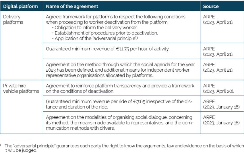 France has progressively developed a comprehensive legal framework that has systematically enhanced the rights of platform workers. This development culminated in six pivotal agreements, addressing some of the most challenging aspects of working conditions on digital platforms, such as account deactivation and minimum revenue. These agreements were reached under the auspices of the Autorité des Relations Sociales des Plateformes d’Emploi (ARPE), a public entity instrumental in facilitating effective social dialogue between digital platforms and trade unions. The establishment of clear administrative procedures governing the negotiations within ARPE has been crucial in formulating measures that digital platforms can effectively implement.