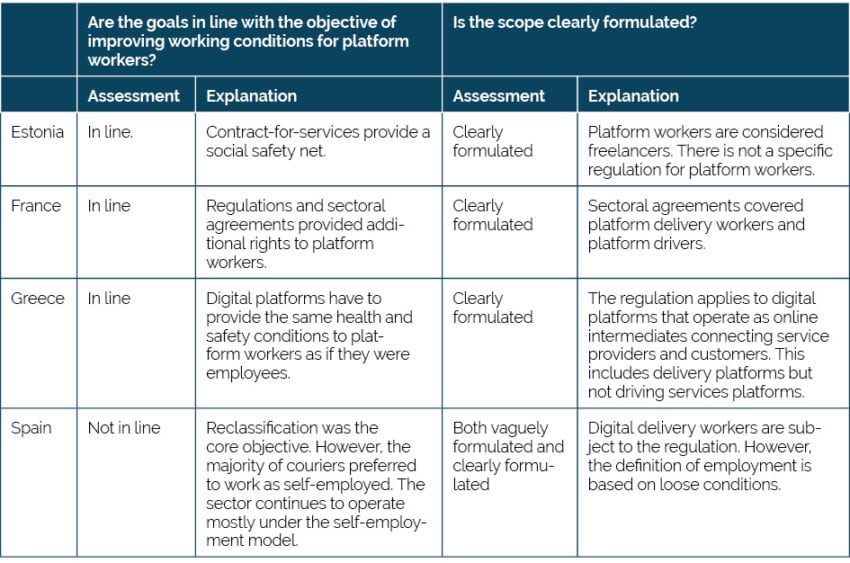 Policymakers in Estonia, France, Greece, and Spain share the common objective of enhancing the working conditions of platform workers. However, variations in their labour markets, legal frameworks, and political landscapes have led to four distinct approaches in achieving this goal. Predominantly, the Spanish regulation has been geared towards attempting to reclassify platform workers from self-employed to employees. In contrast, the regulatory strategies in France and Greece have focused on retaining the sector within the realm of independent work, while simultaneously improving the working conditions of platform workers. Estonia adopted a broader perspective, emphasising the enhancement of working conditions for all freelancers, not exclusively those categorised as platform workers.