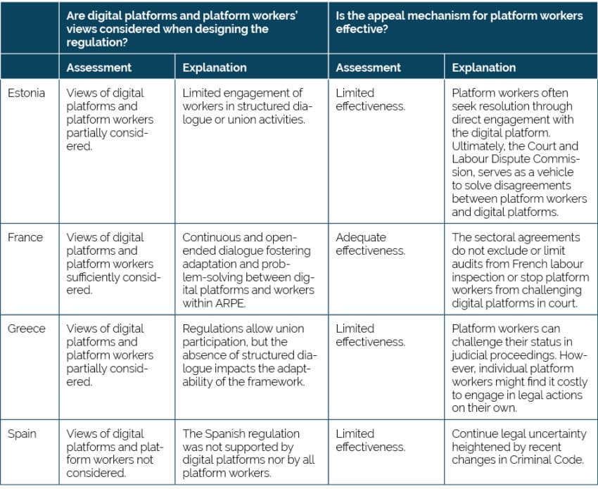 The evaluation of the four countries’ regulations against the three outlined principles offers valuable insights into the regulation of platform work.