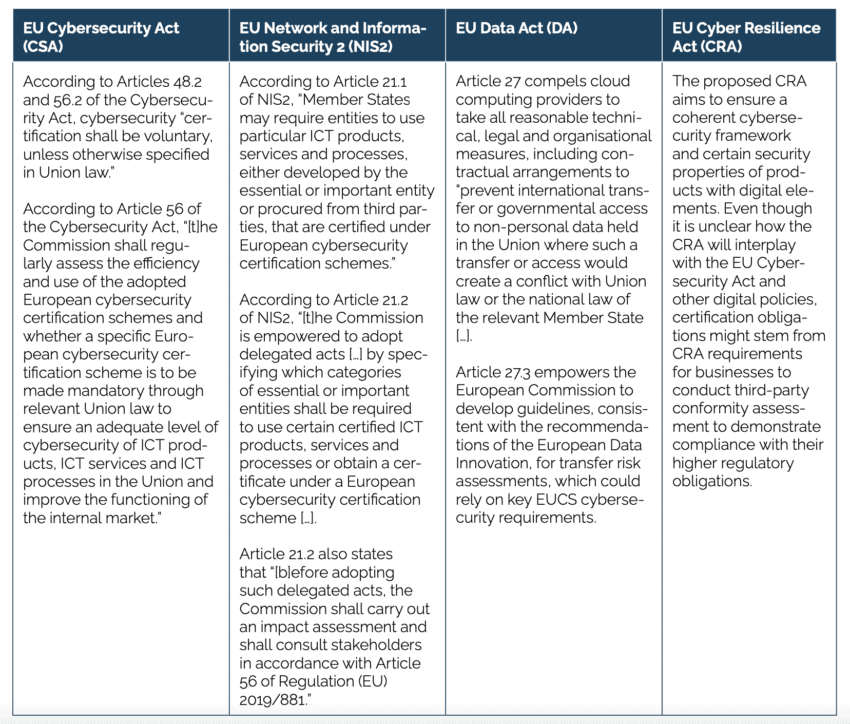 Beyond NIS2, the proposed Data Act could require cloud vendors to obtain an EUCS certification, as part of their legal obligations preceding transfers of non-personal data to non-EU jurisdictions.[4] Additional competences for Member States’ enforcement bodies to require EUCS certification for services in the domestic market will likely result from the proposed CRA (Table 1).
