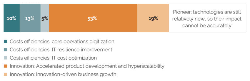 Recent research into more than 700 industry cases across 20 industries demonstrates that businesses maximise the value of cloud adoption in three different ways: rejuvenation, innovation, and pioneering. It is estimated that by far the largest part of the value-added created by the adoption of cloud services is generated through the use of cloud services to foster multiple innovation activities (72%), while about one third (28%) of the value-added from cloud adoption is estimated to stem from increased production efficiencies and associated cost reductions, and reductions in operating costs (see Figure 1 and Table 2).[11] It should be noted that additional value-added originates from “pioneering activities”, such as the early adoption of cloud activities and a wide range of associated future and transversal technologies such as quantum computing and blockchain solutions. The economic impacts of these activities are difficult to estimate ex-ante, but they can be expected to be enormous especially over the medium- to the long-term. Missing out on pioneering activities could advance the EU’s profound productivity and technological gap vis-à-vis the US and other jurisdictions[12], at least for organisations whose choice will be limited to EU-only cloud solutions.