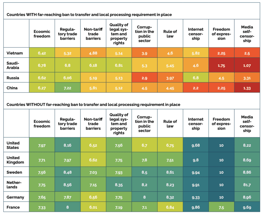 It should be noted that WTO law and trade agreements recognise the right to regulate in the interest of “national security”. However, it is striking that in the area of cross-border data flows the very countries that rely on this exception are those that restrict civil liberties, freedom of expression, freedom of the press, and basic economic freedoms the most (see Table 3).