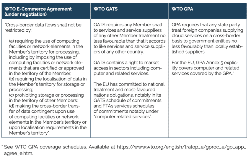 Similar limitations apply for key WTO agreements: the General Agreement on Trade in Services (GATS) and the Agreement on Government Procurement (GPA), and the currently negotiated WTO E-Commerce Agreement, where the EU is a known opponent to national restrictions to the free cross-border flow of non-personal data in the recent past (Table 4).[4]