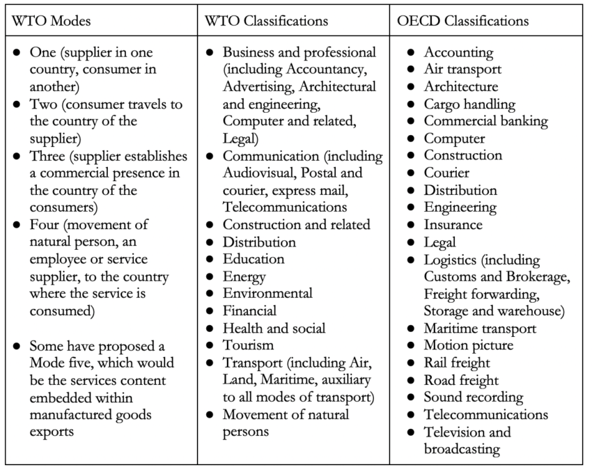 A key problem is the lack of an agreed international definition of services. The table shows different ways of considering services trade: