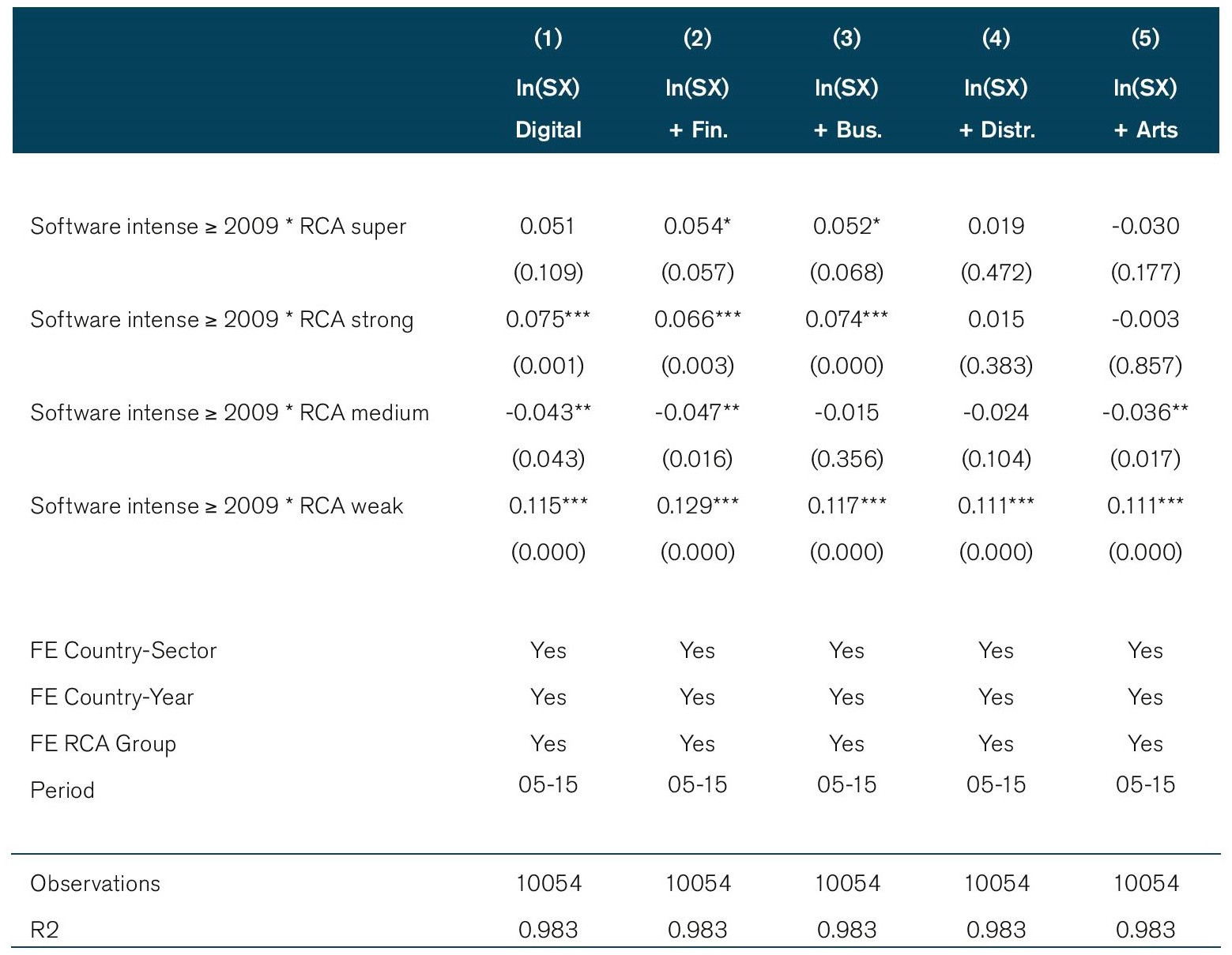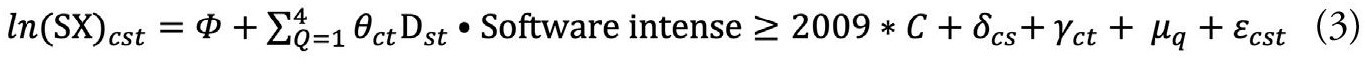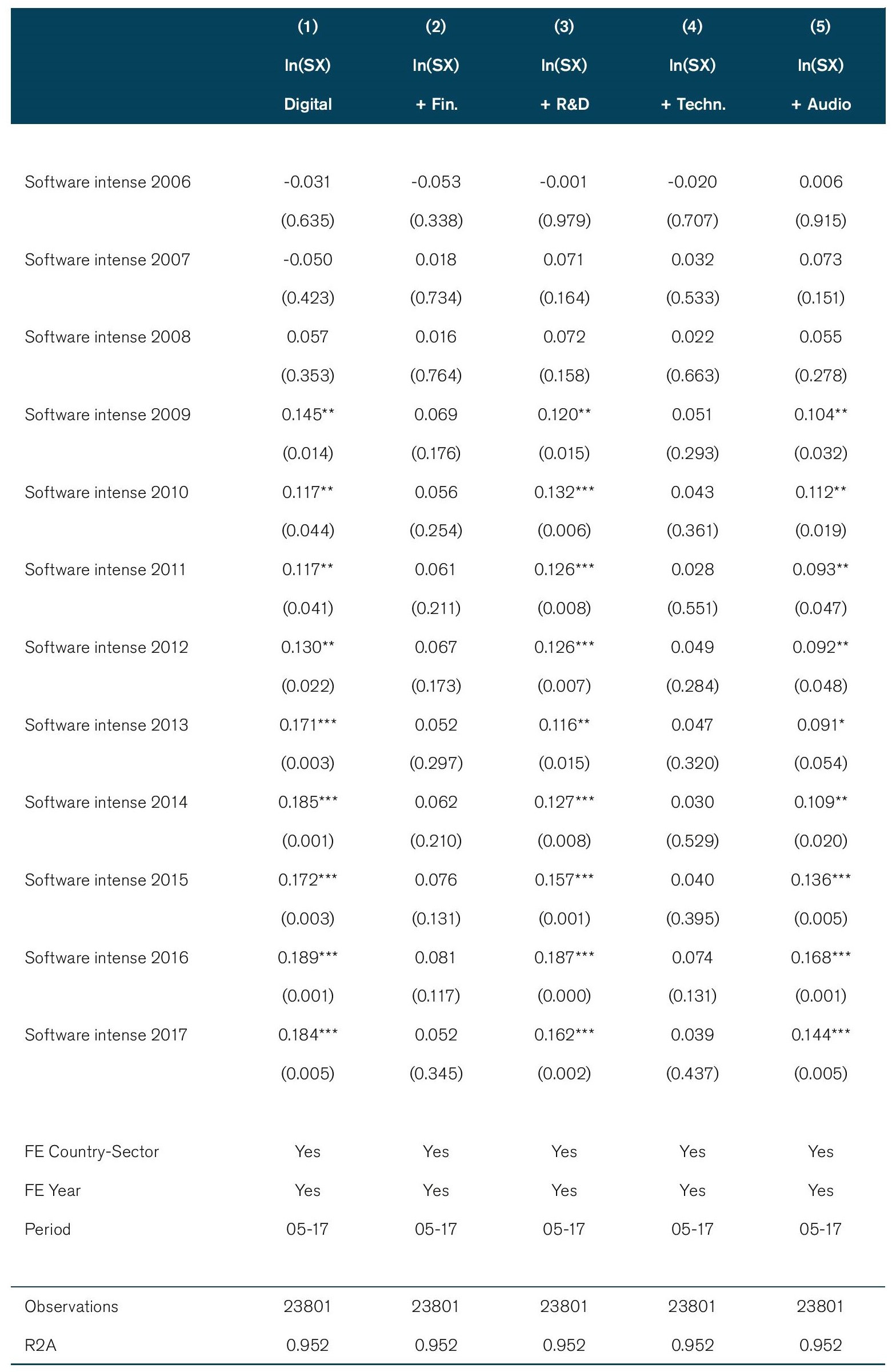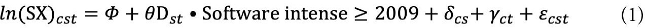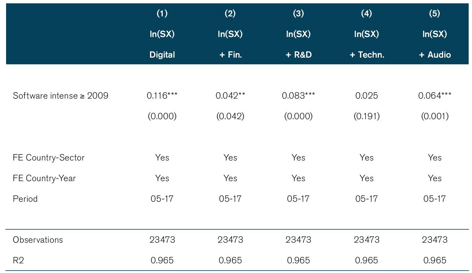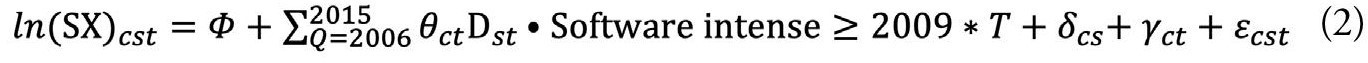 In equation (1), the response variable is the logarithm of cross-border exports of services (SX) in country c, for service sector s in time t. Data is taken from two sources to check for consistency of results across the two data sets, which are the WTO-UNCTAD-ITC annual trade in services and the underlying trade in services data as part of the OECD TiVA principle indicators. Then, the term denotes the dummy variable that is of interest. It captures any difference in services exports between software-intense and none-software-intense services before and after 2009.