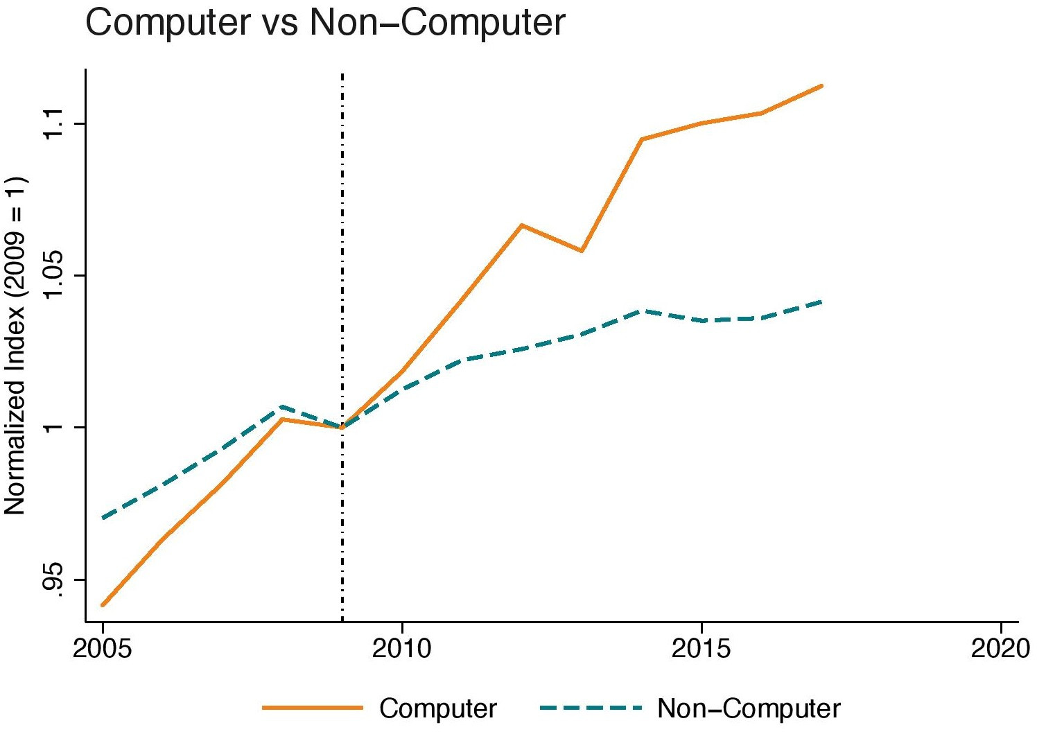 The year 2010 is selected for computing software-intensities. Choosing this year avoids the risk of being endogenous to the trade data as it lies in the middle of the time period. Software expenditure is divided over labour, for which we also use data for the year 2010. Data for labour is sourced from the US Bureau of Labour Statistics (BLS). These software-intensities are therefore similar to the ones computed in Ferracane and van der Marel (2020). For our DID analysis all we need is an indicator that assigns unity to a services sector that is assessed as software intense. In doing so, we determine a services sector as software-intensive on the basis of whether a 2-digit sector shows a software-over-labour ratio which is higher than the sample median. Sectors with a ratio below the median are assigned a zero.