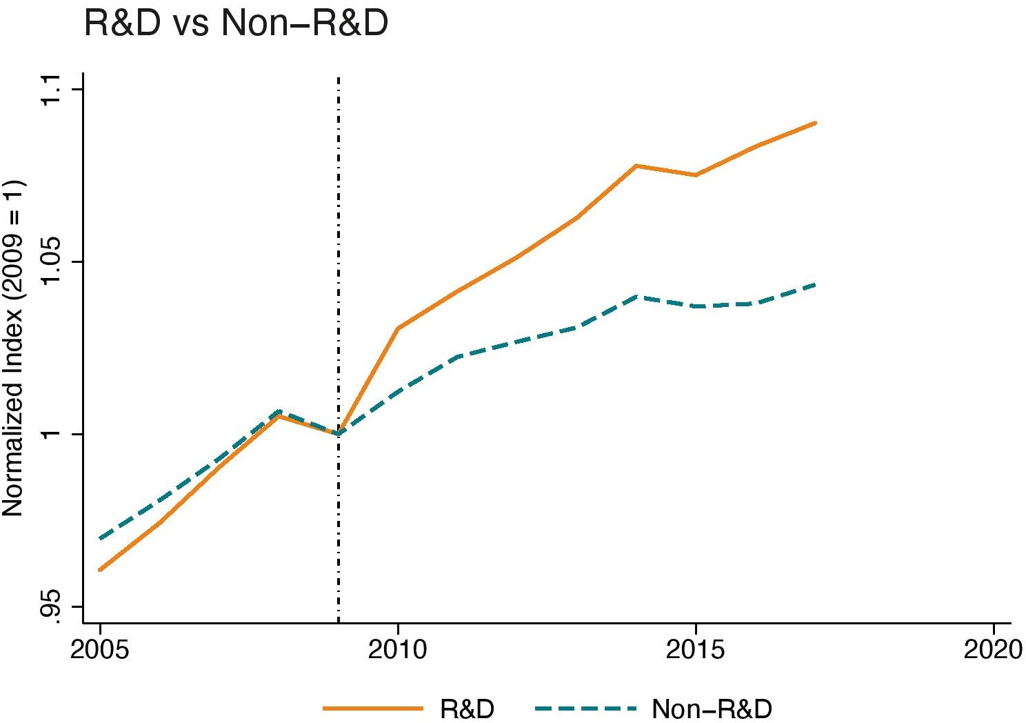 As said, the empirical strategy employs a Difference-in-Difference (DID) approach in which the outcome variable is regressed against a set of dummies that separate two groups for two time periods. The two groups are the treatment group, the other one the control group. As with a standard DID analysis, the treatment group is exposed to a “treatment” in the second period, whereas the control group is not subjected to the treatment during either time period.